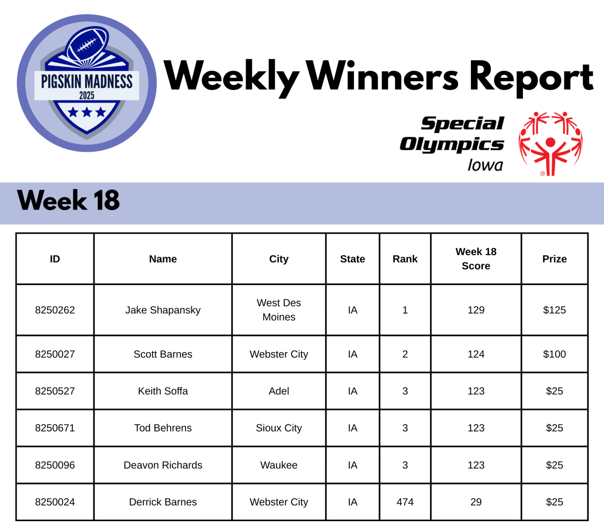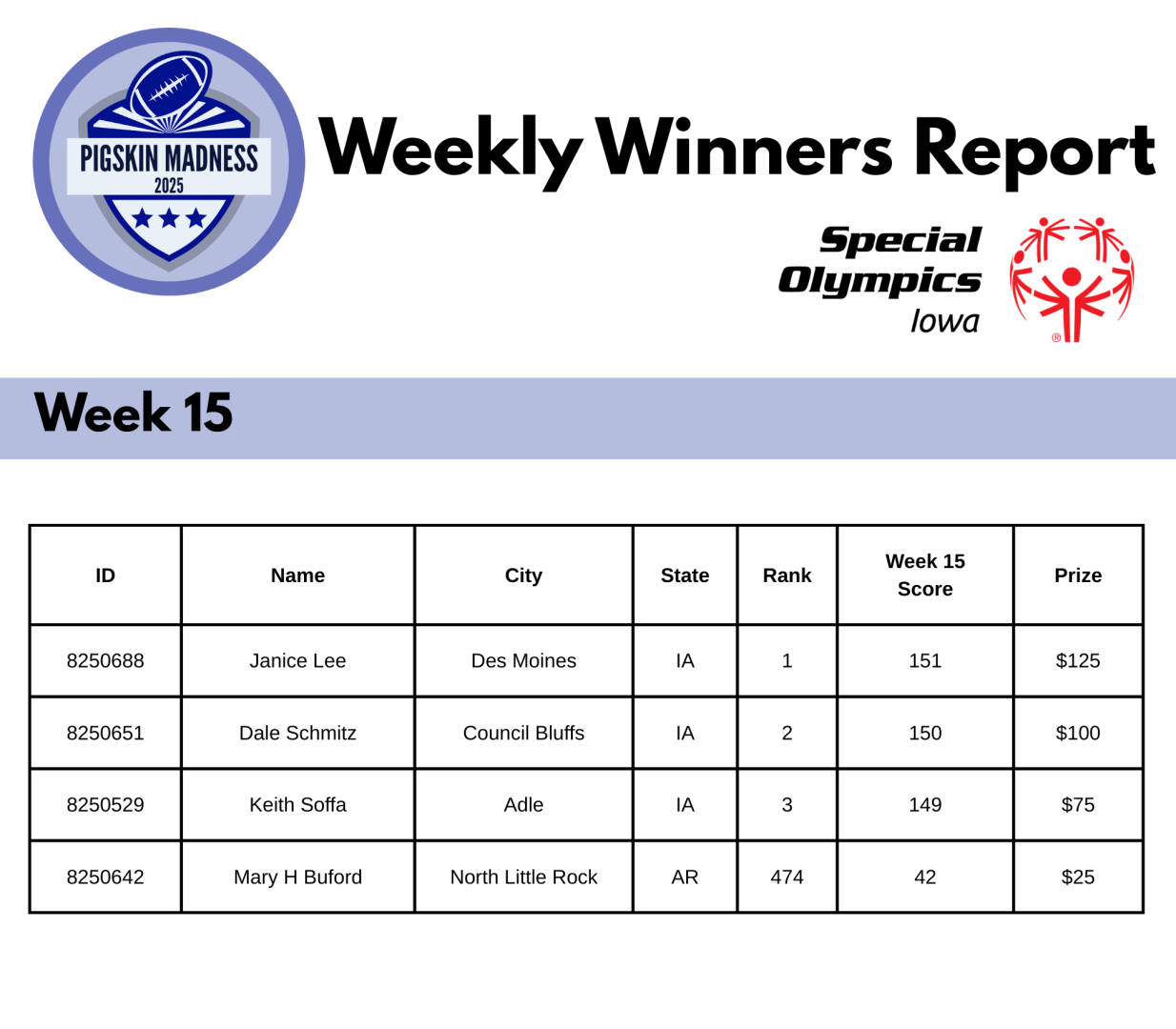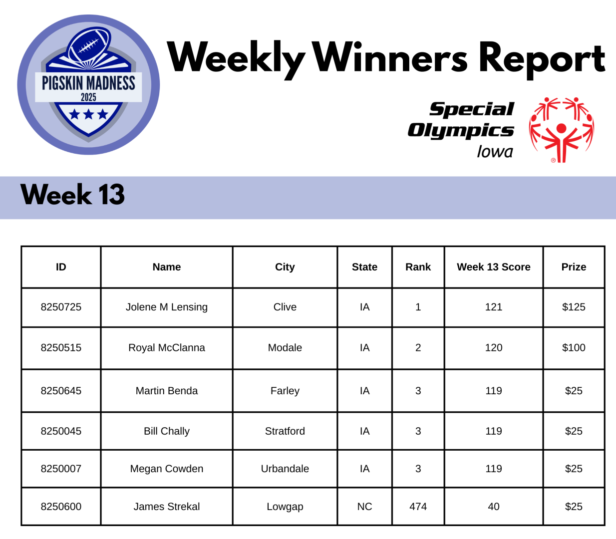 - Each week is considered an independent raffle. It is not required to purchase the entire 18 weeks. Anyone purchasing individual weeks or a partial packet of 18 weeks must contact the Special Olympics Iowa office for details.