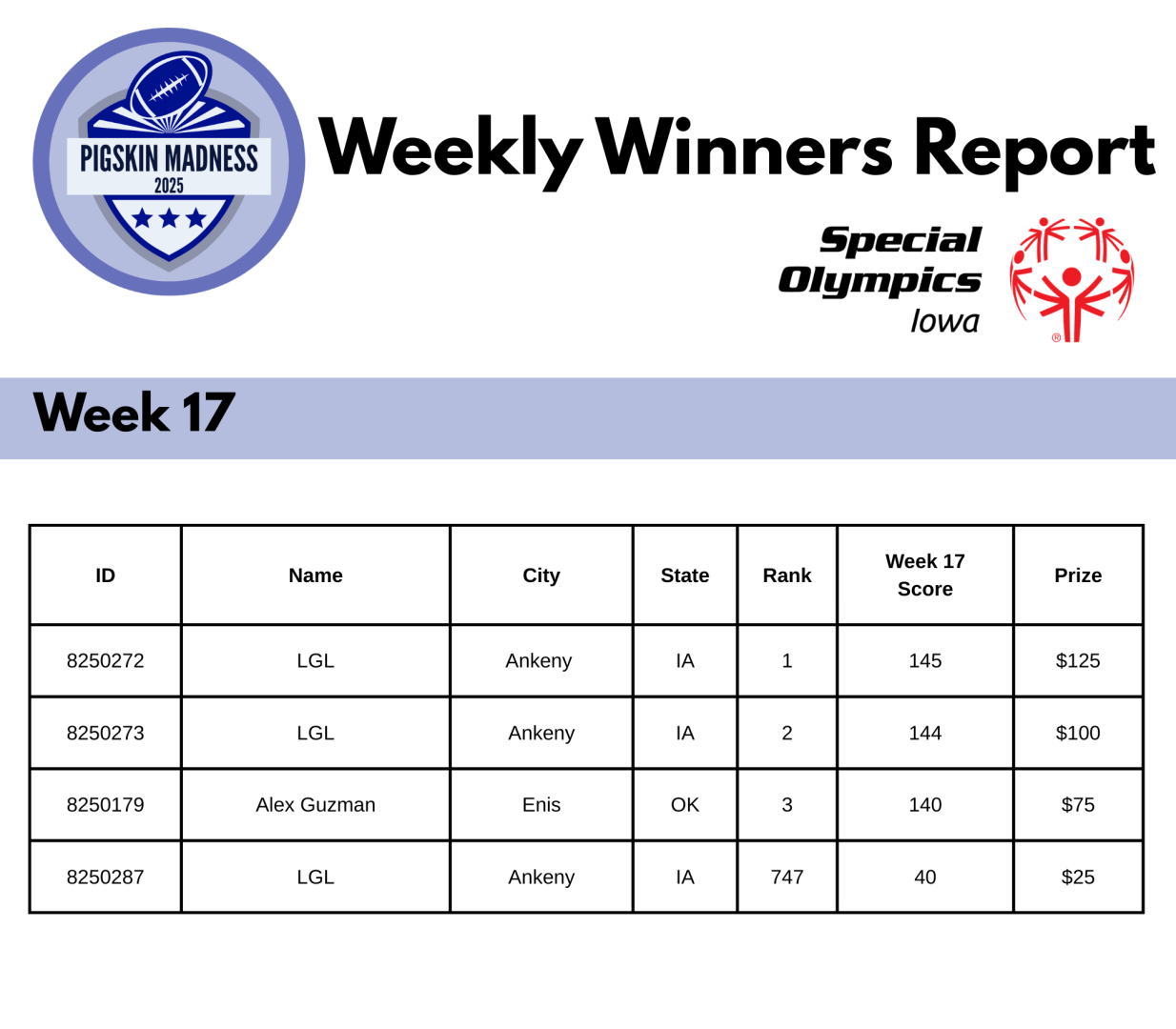 - Week 17 Winners